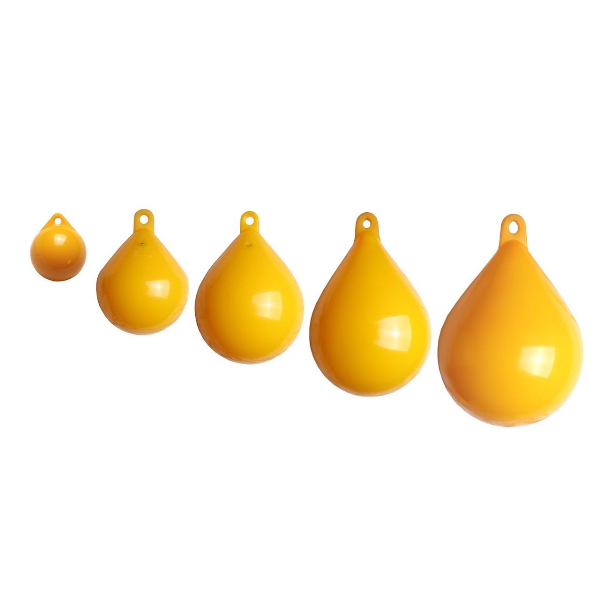 Pneumatyczne pływaki z PCW w kształcie łzy, ze wzmocnionym uchem, stosowane jako boje znacznikowe lub odbijacze. Kolor żółty.